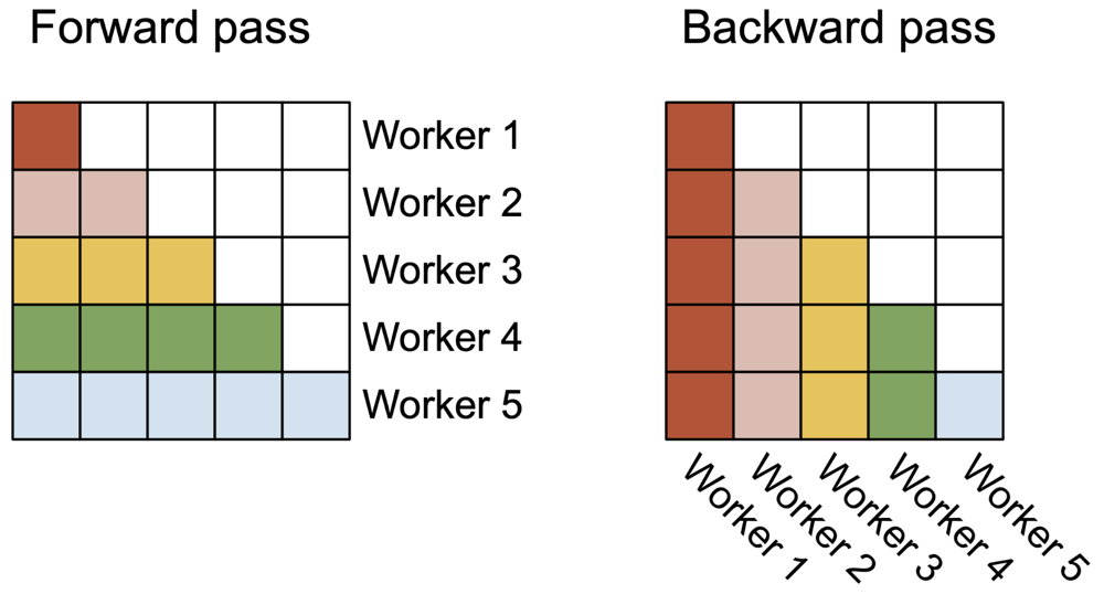 图 3:FlashAttention-2 中跨线程块的并行调度示意。左图为前向传播:每个“Worker”(线程块)负责注意力矩阵的一块行片段,例如 Worker1 处理红色行块,Worker2 处理粉色行块等。右图为反向传播:每个线程块负责一块列片段,例如 Worker1 处理红色列块,Worker2 处理粉色列块等。这种沿序列长度的划分提高了长序列小批量情况下 GPU 的利用率。