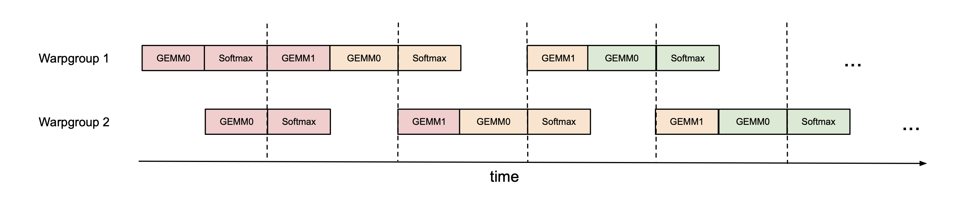 图 5:FlashAttention-3 中跨 Warp 组的 Ping-Pong 异步调度。Warp 组 1(上方)和 Warp 组 2(下方)交替执行矩阵乘 GEMM 和 Softmax 操作:当一组等待矩阵乘结果时,另一组利用空闲执行 Softmax。虚线分隔不同迭代,彩色块表示 GEMM 或 Softmax 所占用的时间段。这样实现两类操作重叠并行,提高了硬件利用率。
