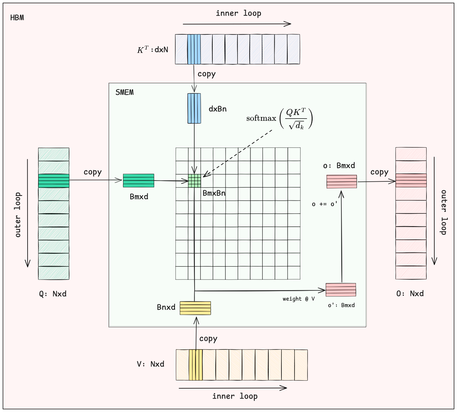 外层循环遍历 矩阵的小块,这里每一个块都包含 个 token,其中每个 token 的维度为 。因为通常使用的是多头注意力机制,每个头的维度通常为 64 到 128 这样的量级,所以这里 通常不会很大, 矩阵的分块可以很容易地加载到共享内存中进行计算。