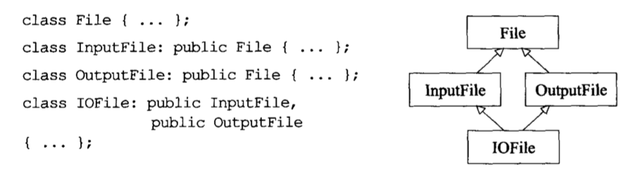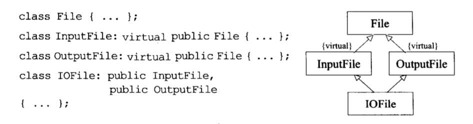 base class和某个derived class之间有一条以上的相通路线,假设File class有个成员变量fileName,那么IOFile从每一个base class各继承一份,所以其对象内会有两份fileName成员变量。然而IOFile对象只该有一个文件名称,所以名称fileName不该重复。解决办法就是采用