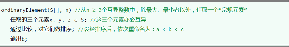 取前三个元素x = S[0]、y = S[1]和z = S[2],这一步只需执行三次(从特定单元读取元素的)基本操作,耗费O(3)时间。接下来,为确定这三个元素的大小次序,最多需要做三次比较,也需O(3)时间。最后,输出居中的非极端元素只需O(1)时间。因此,上面取非极端元素算法的时间复杂度为:T(n) = O(3) + O(3) + O(1) = O(7) = O(1)。