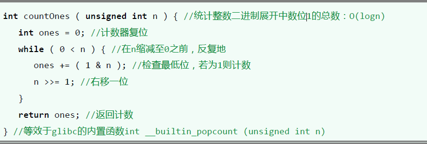 根据右移运算的性质,每右移一位,n都至少缩减一半。也就是说,至多经过1 + log2n次循环,n必然缩减至0,从而算法终止。因此时间复杂度为:O(1 + log2n) = O(log2n) 。